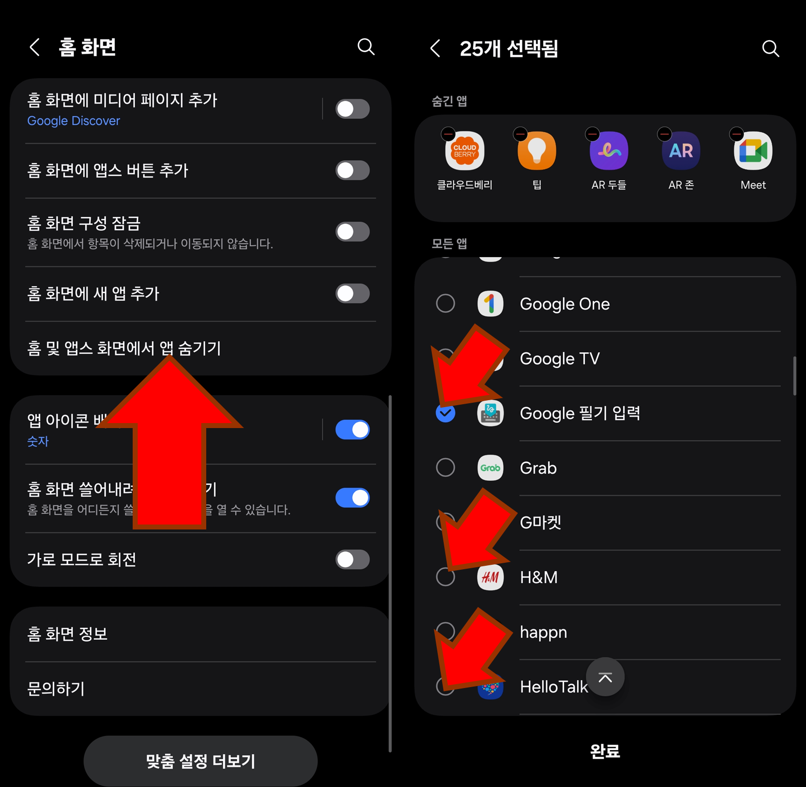 - 현재 숨겨진 앱 목록에서 표시하고 싶은 앱을 선택 해제합니다.