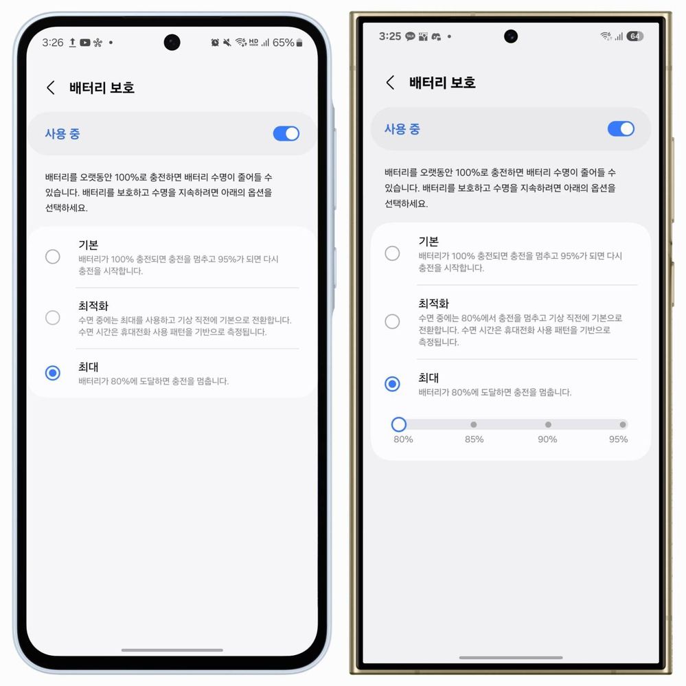 배터리 수명에 민감한 사용자를 위해 One UI 7은 배터리 보호 기능에서 최대 충전량을 세분화하여 선택할 수 있는 옵션을 제공합니다.