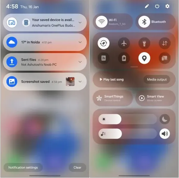 이제 빠른 설정 창이 One UI 6 스타일로 변경되어, 알림과 빠른 설정 토글이 한 페이지에 표시됩니다.