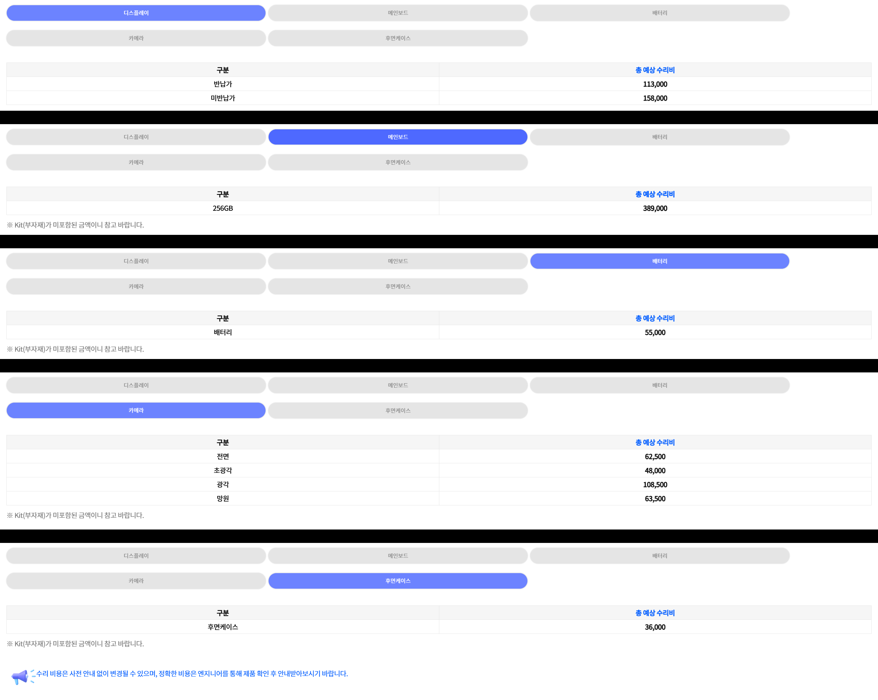 ※ 삼성 서비스센터에서 가져온 내용으로 수리비는 일부 다르게 적용될 수 있습니다.