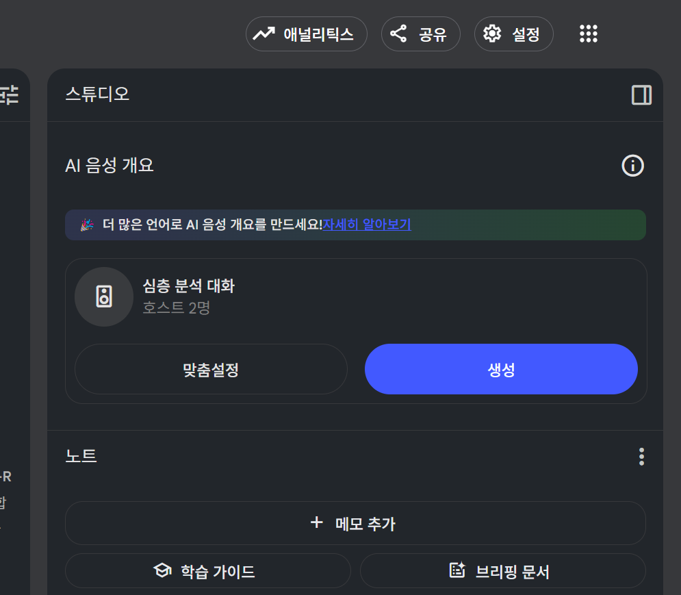 - 우측의 스튜디오(Studio) 탭에서 AI 음성 개요(Audio Overview)를 선택합니다.