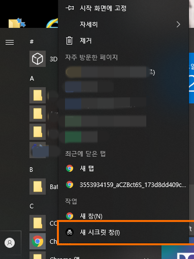 - 아이콘 우클릭: 작업표시줄에 있는 크롬 아이콘을 마우스 오른쪽 버튼으로 클릭하고 새 시크릿 창을 선택합니다.