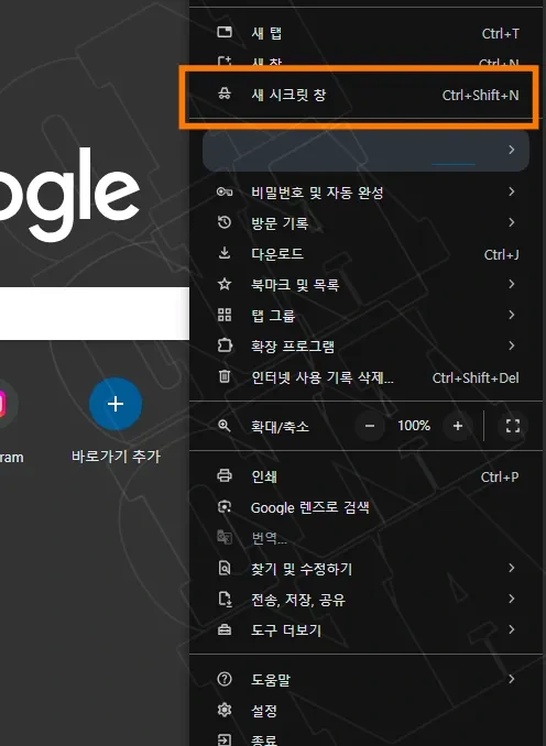 - 도구창 사용: 크롬 브라우저 오른쪽 상단의 **메뉴 버튼(점 세 개)**을 클릭하고 새 시크릿 창을 선택합니다.