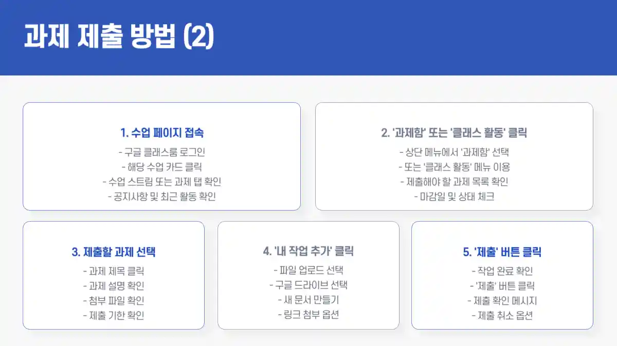 과제는 일반적으로 Google Docs, Google Slides, PDF, 또는 파일 업로드 형식으로 이뤄집니다.