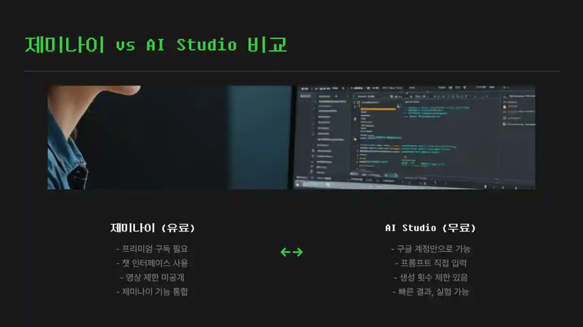 제미나이는 향후 기능 확장과 함께 제미나이 내 챗 인터페이스를 통한 영상 생성 경험을 기대할 수 있으나, 현재로서는 AI Studio의 접근성과 무료성이 더욱 매력적인 요소입니다.
