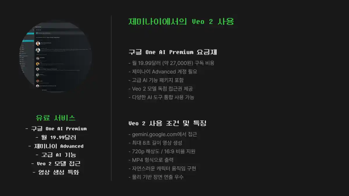 제미나이(Gemini)를 통해 Veo 2로 영상을 생성하려면 유료 구독 서비스인 구글 One AI Premium 요금제가 필요합니다.