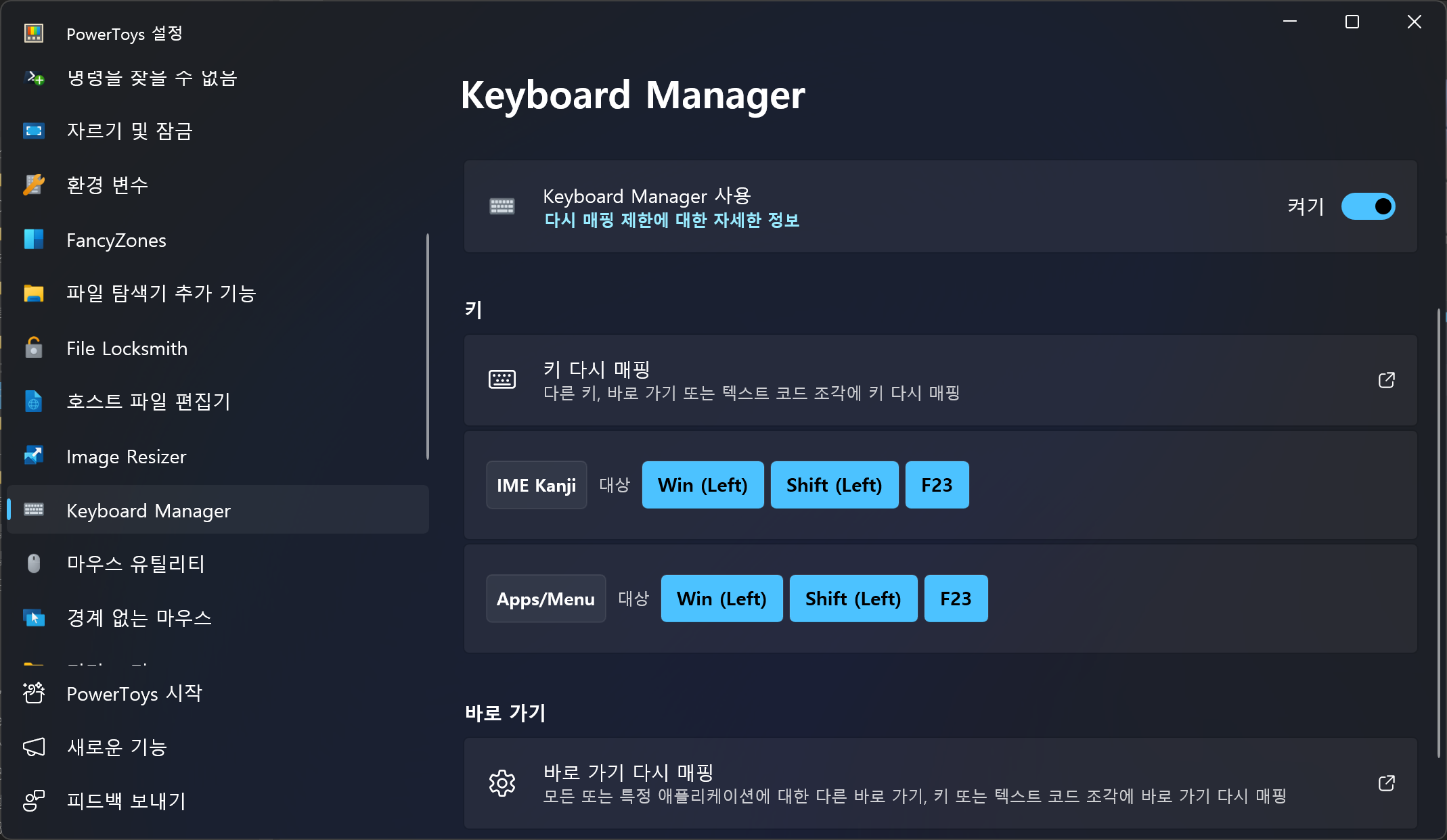 - ‘파워 토이’를 실행한 후, 좌측 메뉴에서 ‘Keyboard Manager’를 선택합니다.