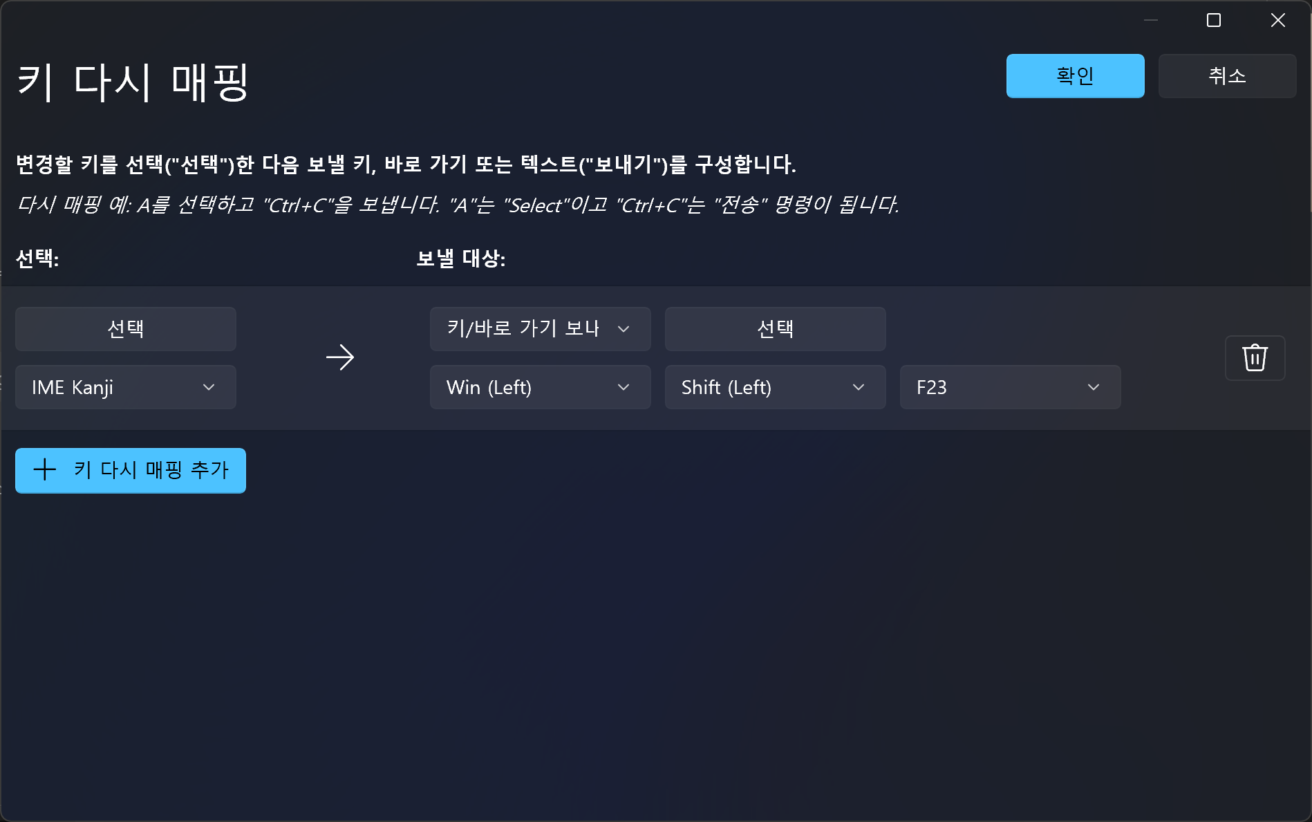 - ‘보낼 대상:’ 항목 아래의 ‘키’를 클릭하고, 순서대로 ‘Win(Left)’, ‘Shift(Left)’, ‘F23’ 키를 설정합니다. 각 키를 선택한 후 ‘확인’을 클릭합니다.