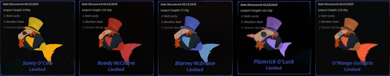 피쉬 행운 이벤트 기간에만 잡을 수 있는 물고기는 총 다섯 마리입니다. 이들은 행운의 낚시터에서만 출현하며, 각기 다른 고유한 특징을 지니고 있습니다. 마치 Orca Migration Event와 유사하게 특정 위치에 국한되어 나타나지는 않지만, 뚜렷한 색상 패턴으로 쉽게 구별할 수 있습니다. 또한, 행운 이벤트 낚시터 위에 나타나는 무지개의 색깔 모자를 통해 어떤 물고기가 낚일지 미리 알 수 있습니다. 이 물고기들은 피쉬 행운 퀘스트 이벤트를 완료하는 데 필수적인 요소입니다.