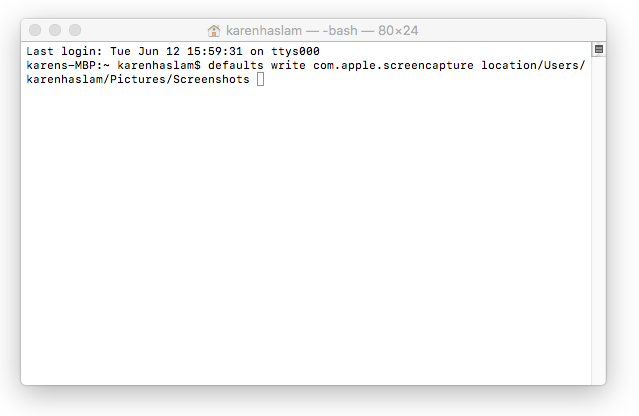 - defaults write com.apple.screencapture location을 입력하고 스페이스바를 누릅니다.