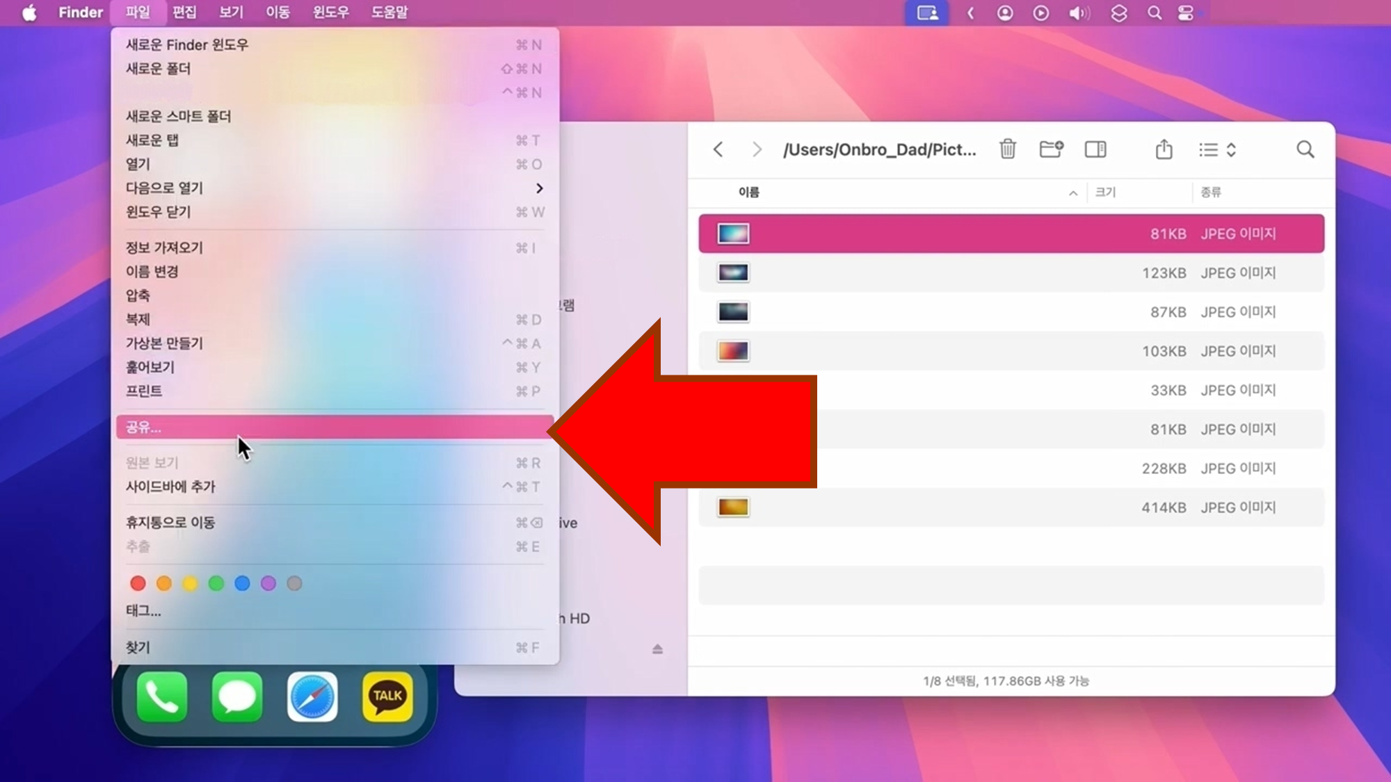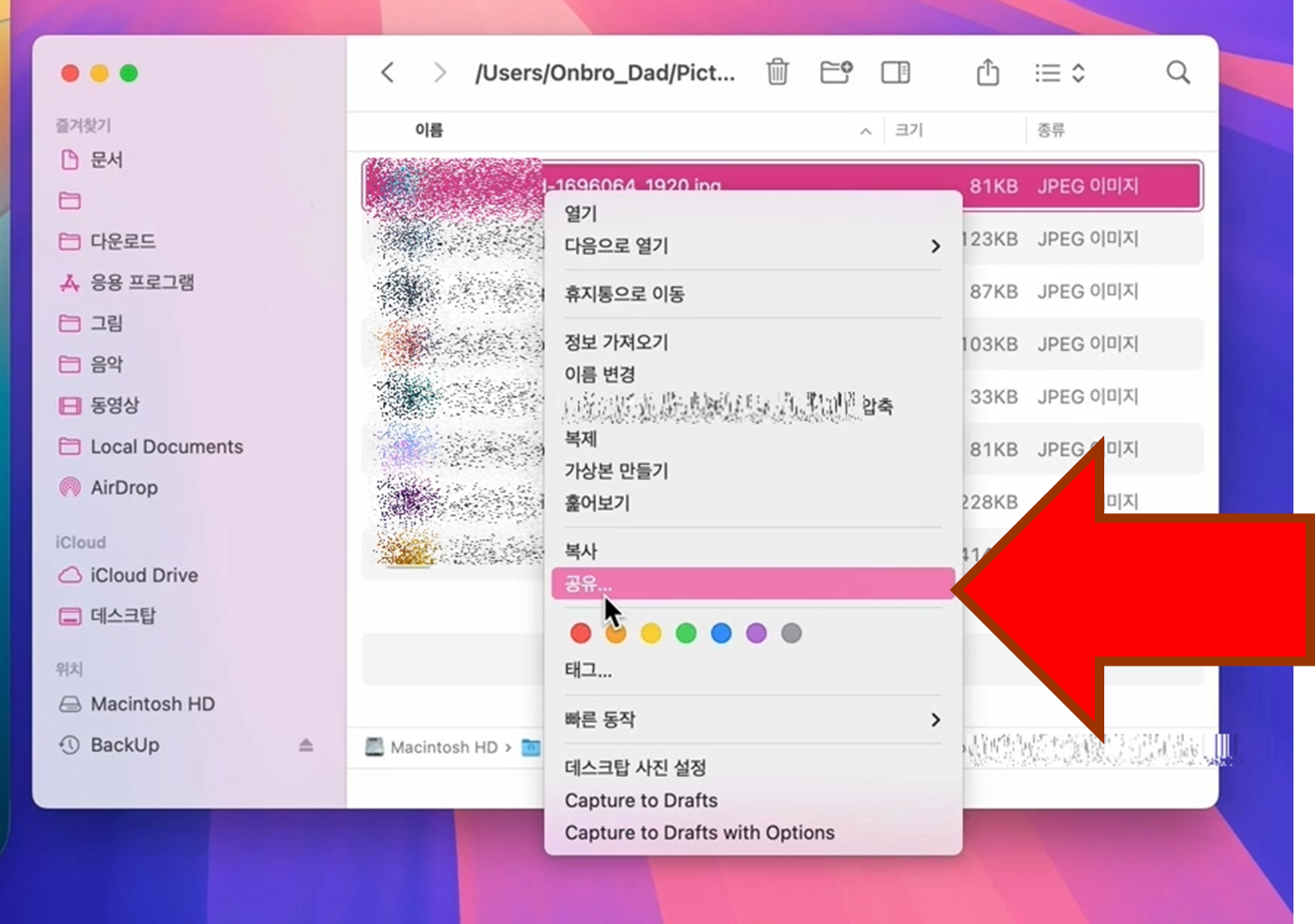 맥북에서 에어드롭 전송을 원하는 파일을 선택한 후 아래와 같은 방식으로 보낼 수 있다.