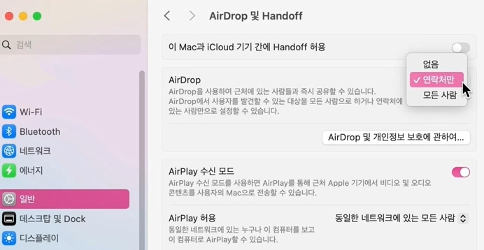 | 파인더 이용 시 | 파인더 → 에어드롭 → ‘나를 발견할 수 있는 사람’ 설정 | ‘연락처만’ 또는 ‘모두’ 선택 |