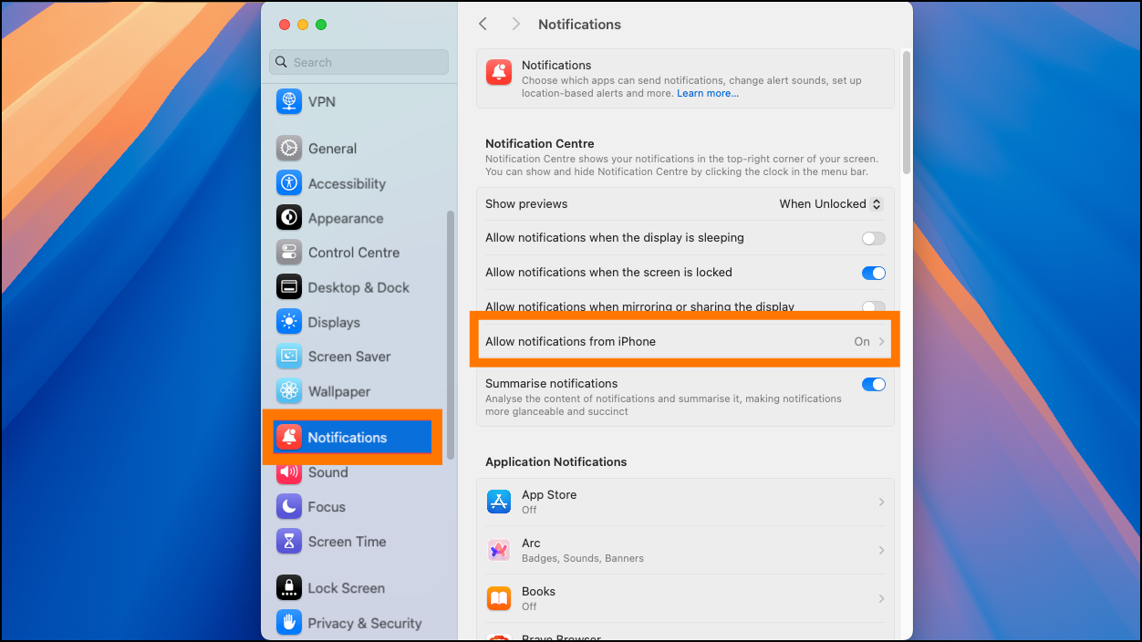 3. 아이폰으로부터의 알림 허용 토글을 비활성화하면 맥의 알림 센터에 아이폰 알림이 더 이상 표시되지 않습니다.