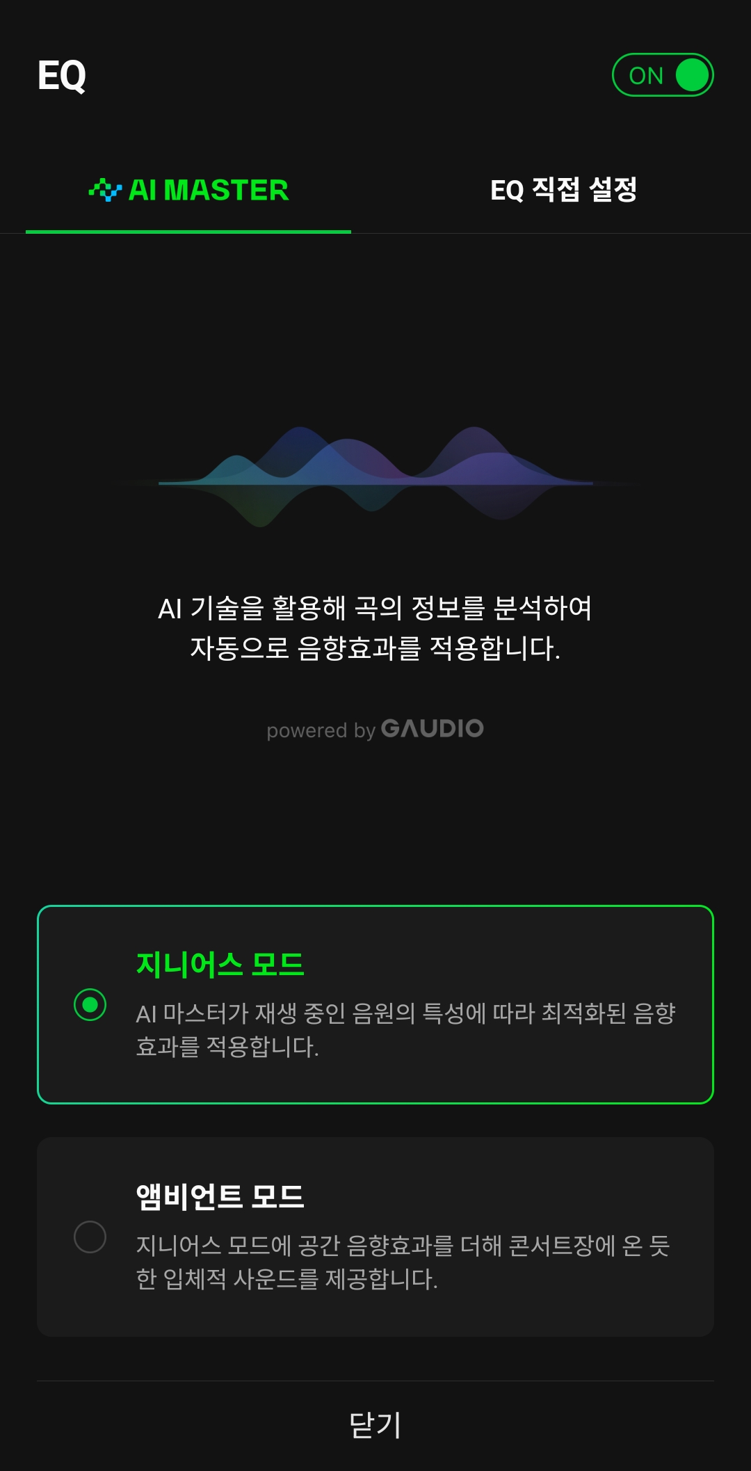 주의: 사용자가 직접 EQ를 설정하거나 프리셋을 선택하는 경우, AI 마스터 기능은 자동으로 해제됩니다.