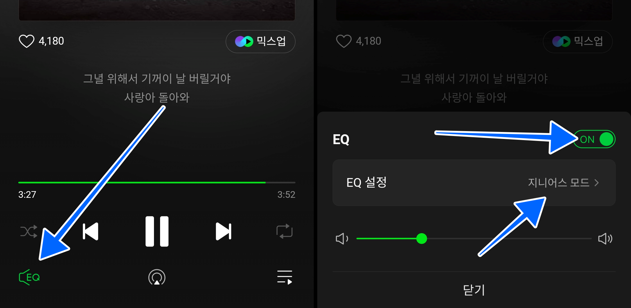 - 멜론 앱 플레이어 화면 좌측 하단 EQ 버튼 클릭