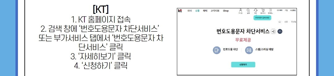 - KT 홈페이지/앱: KT 홈페이지 또는 마이케이티 앱에 로그인하여 부가서비스 > 안심 > (안심) 번호 도용 문자 차단 서비스 메뉴에서 서비스를 신청할 수 있습니다.