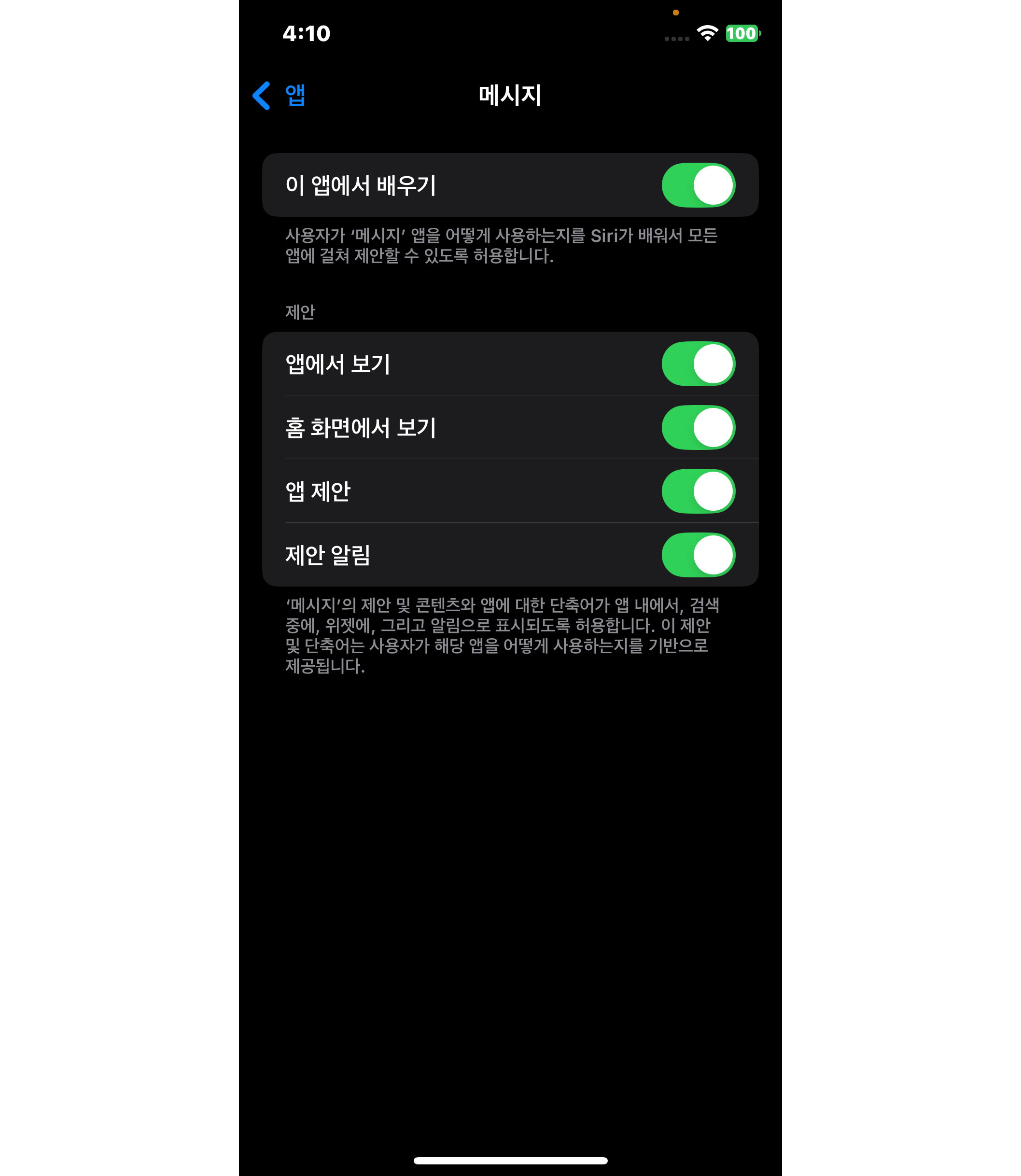 - 이 앱에서 배우기와 제안 섹션의 모든 슬라이더를 끕니다.