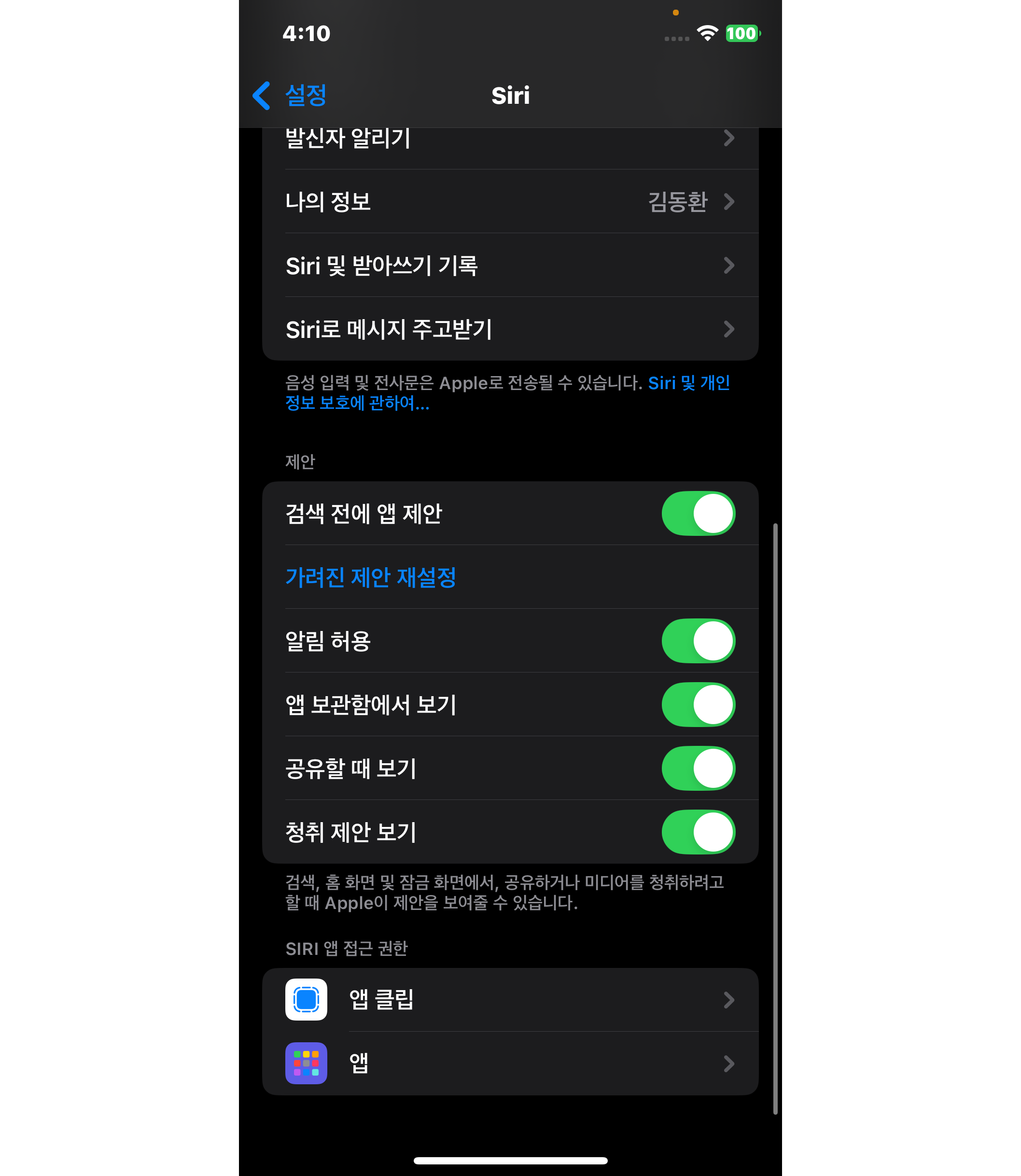 특정 앱에 대한 시리 제안 끄기