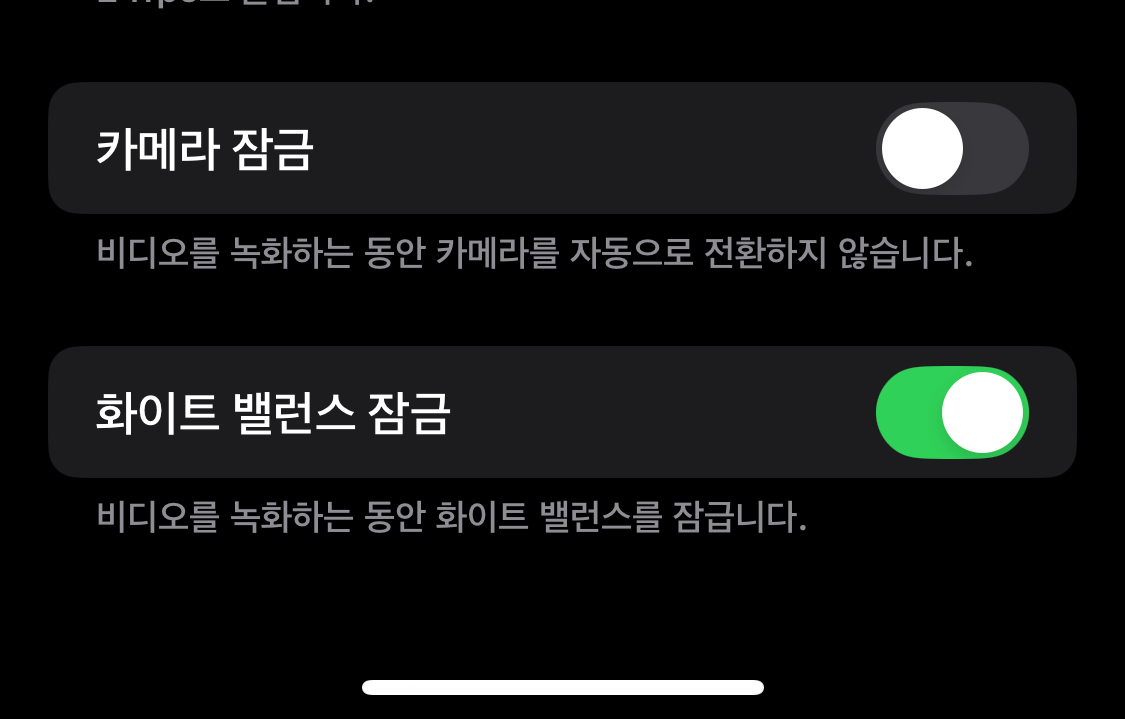 촬영 중에 색감이 갑자기 변하면 영상이 이상하게 나올 수 있습니다. 화이트 밸런스 잠금 기능을 사용하면 처음 설정한 색감을 촬영 끝까지 유지할 수 있습니다. 이 기능도 설정에서 쉽게 켤 수 있습니다.