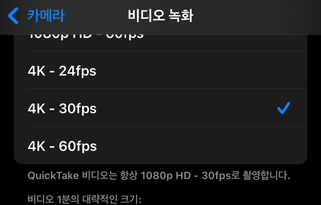 비디오 설정에서 4K -30fps화질을 선택하세요. 이렇게 하면 영상이 더 선명하고 깨끗하게 촬영됩니다. 물론 용량이 커질 수 있지만, 중요한 순간을 최고의 화질로 담고 싶다면 4K로 찍는 것이 좋습니다.