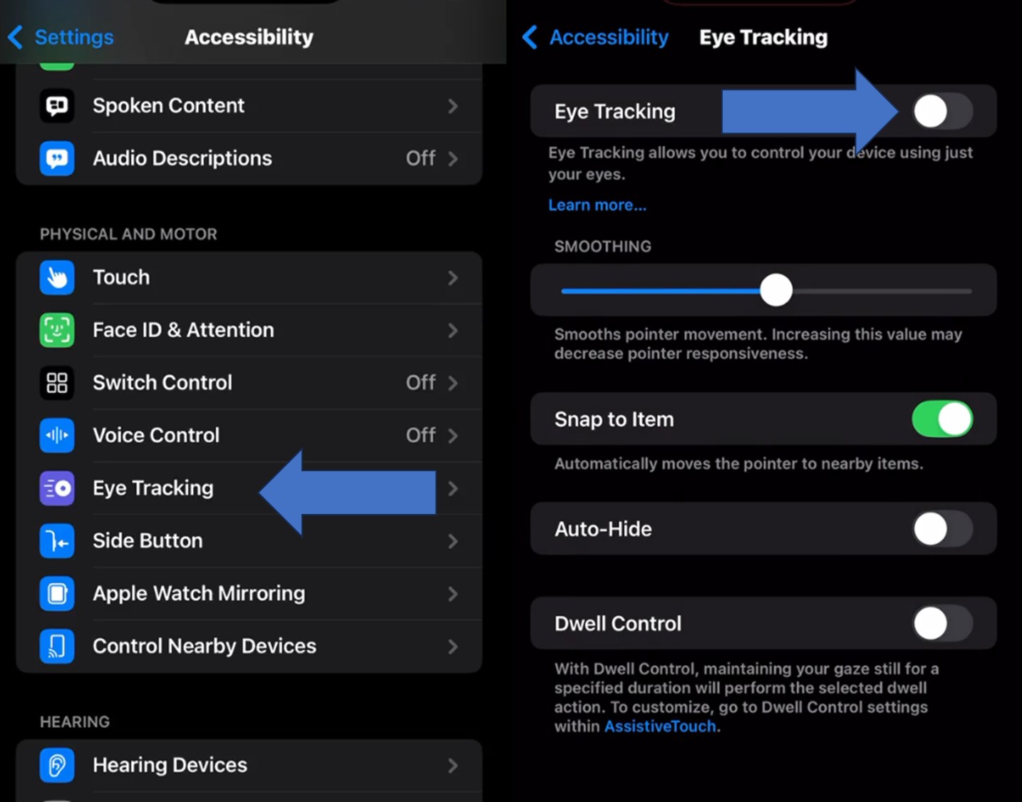 - 눈 추적 선택: '신체 및 동작 지원' 섹션에서 '눈 추적'을 탭합니다.