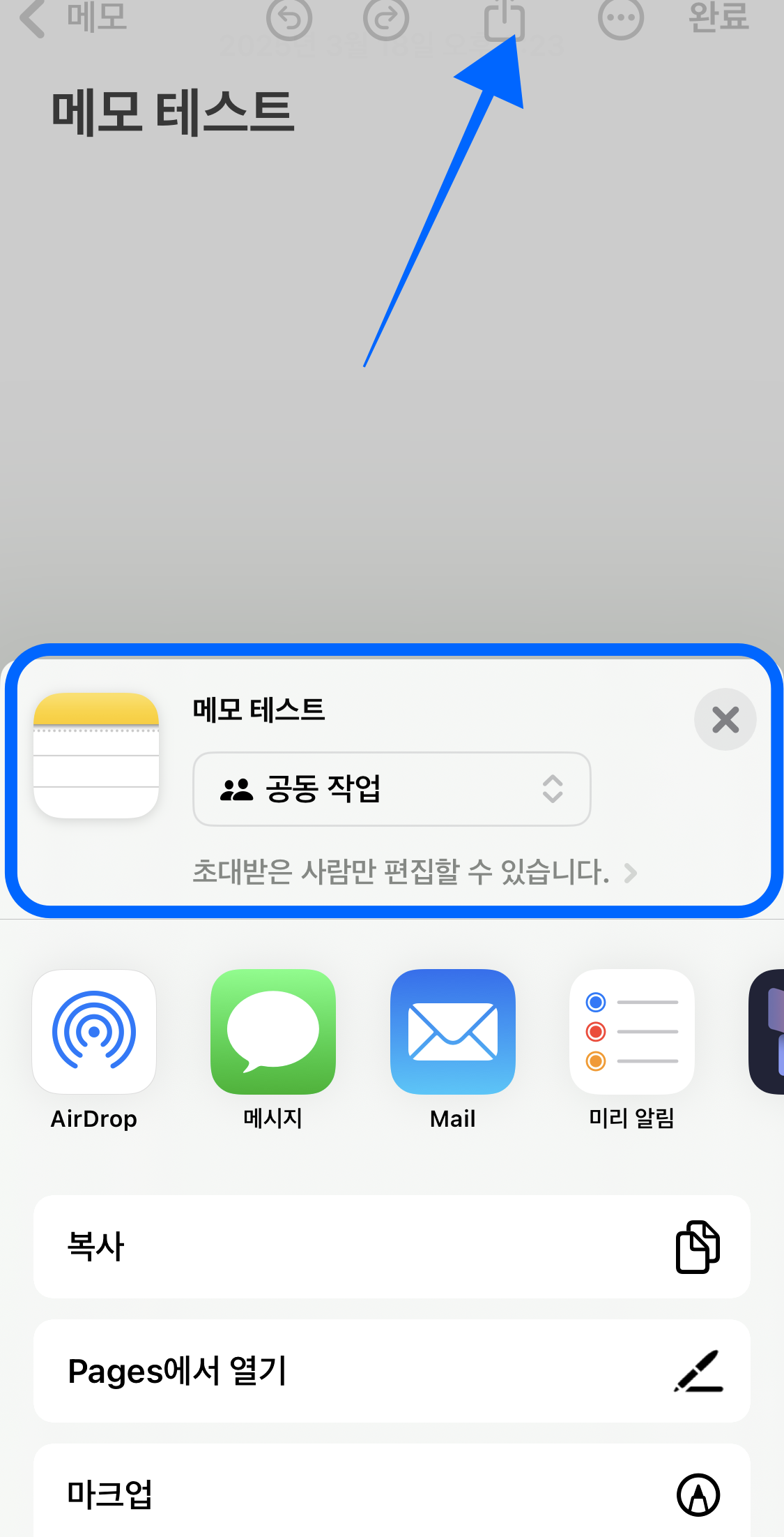 - 또는 메모를 열고 상단에 있는 공유 아이콘을 누릅니다.