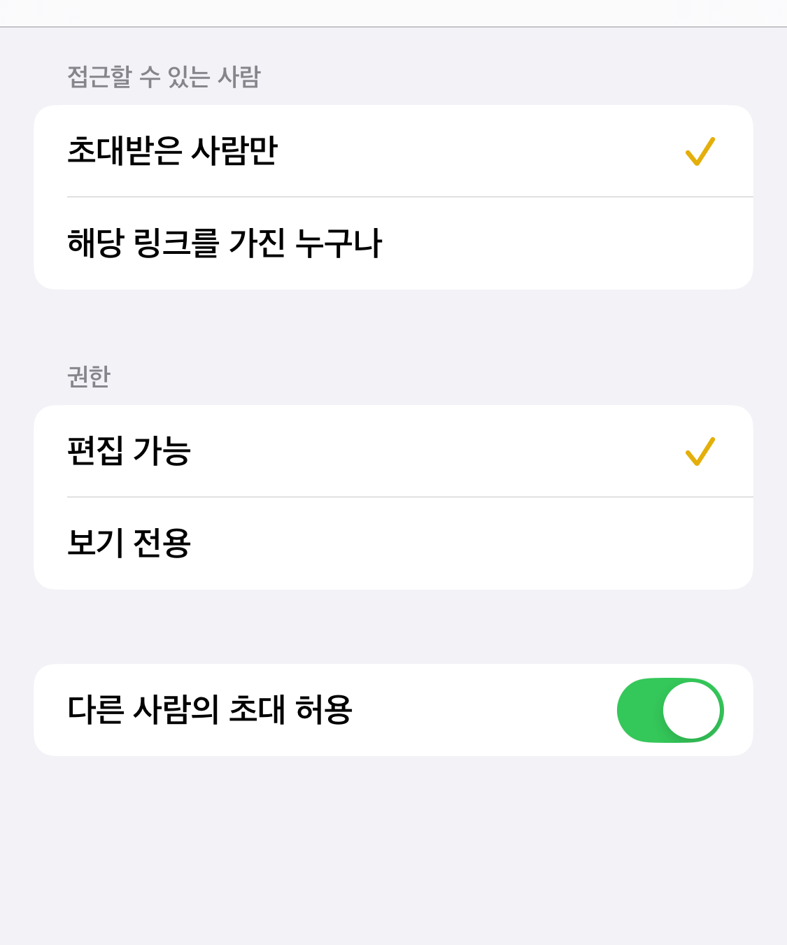 - 공동 작업 옵션 하단 텍스트 탭: ‘공동 작업’ 화면 하단의 텍스트를 탭하면 접근 권한 설정 메뉴가 나타납니다.