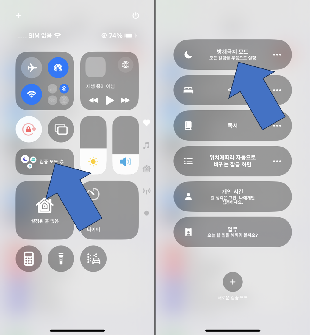 - '집중 모드' 버튼을 탭하여 원하는 모드를 켜거나 끌 수 있습니다.