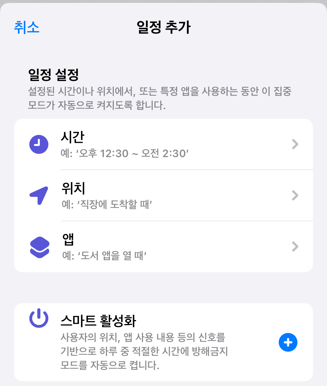 - '완료'를 누르면 설정된 스케줄에 따라 집중 모드가 자동으로 관리됩니다. 위치 기반(특정 장소 도착/출발 시) 또는 특정 앱 실행 시 자동으로 켜지도록 설정할 수도 있습니다.