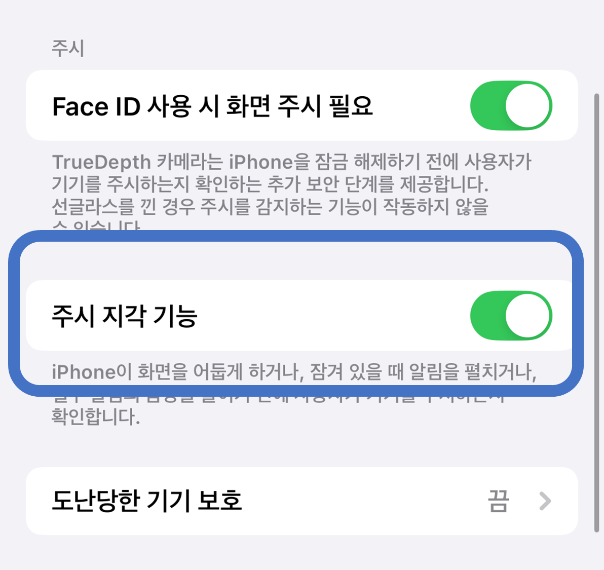 페이스 ID 주시 인식 끄기