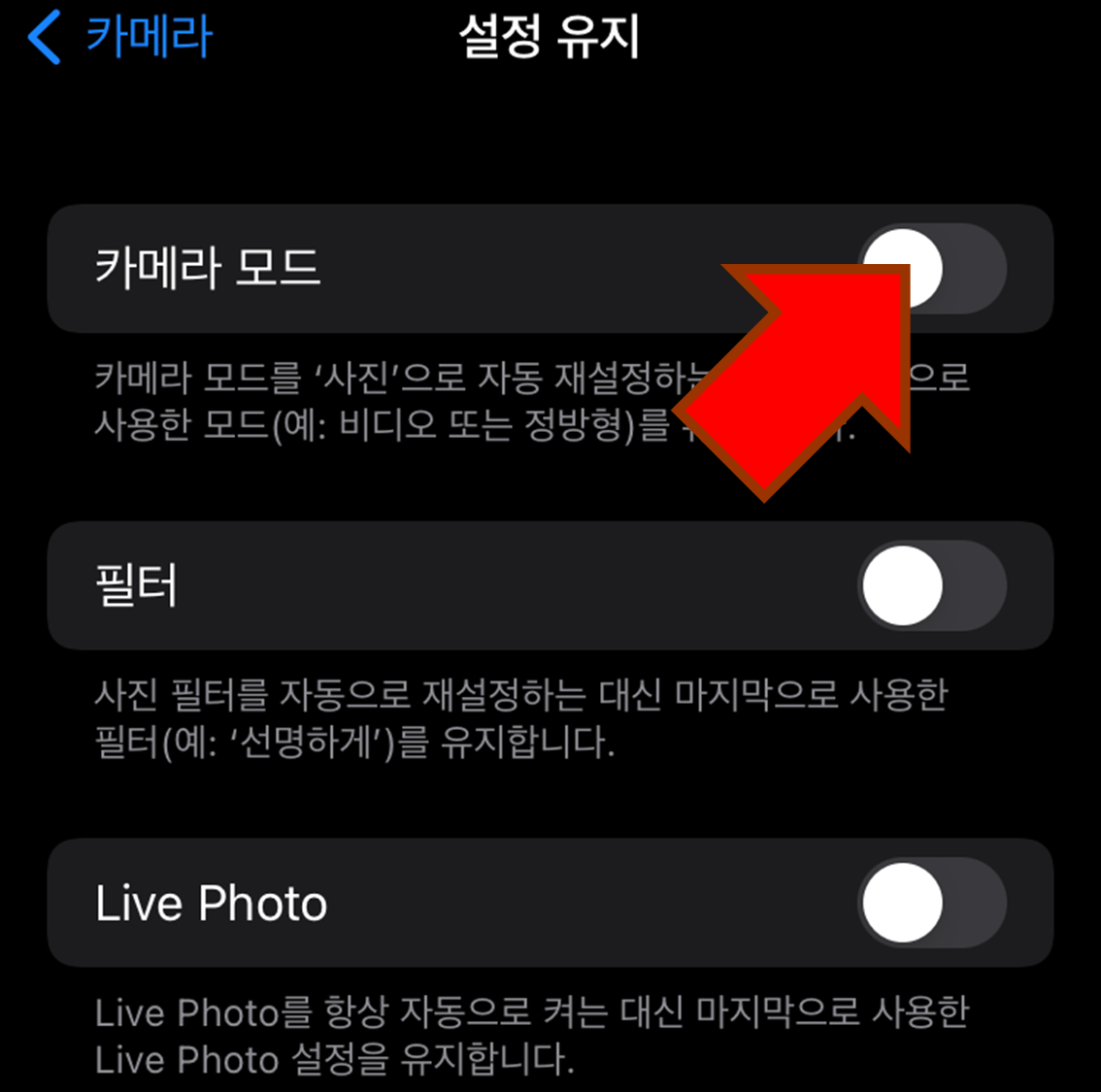 3. 카메라 모드 유지 설정 확인