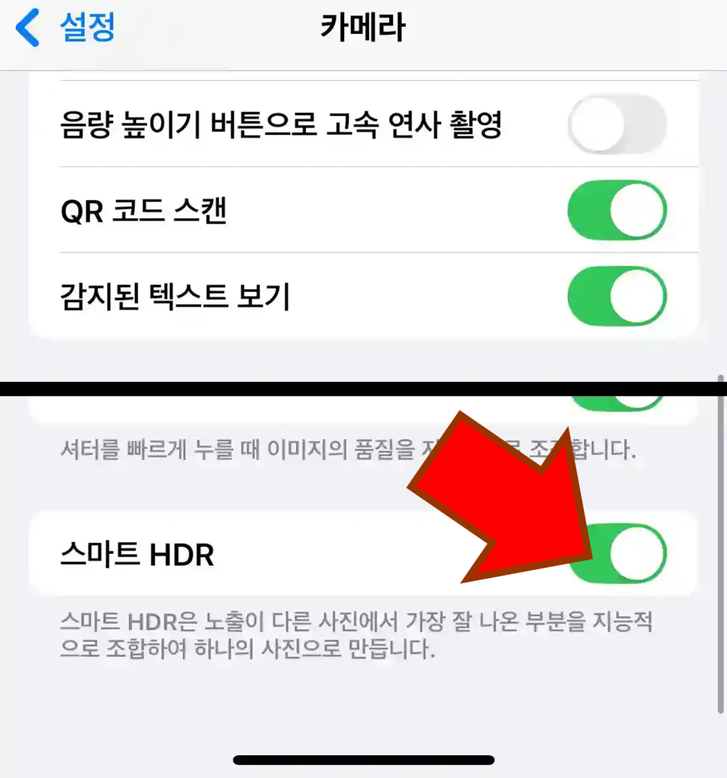 - 설정 → 카메라 → 스마트 HDR 해제로 기본 밝기 유지가 가능합니다.