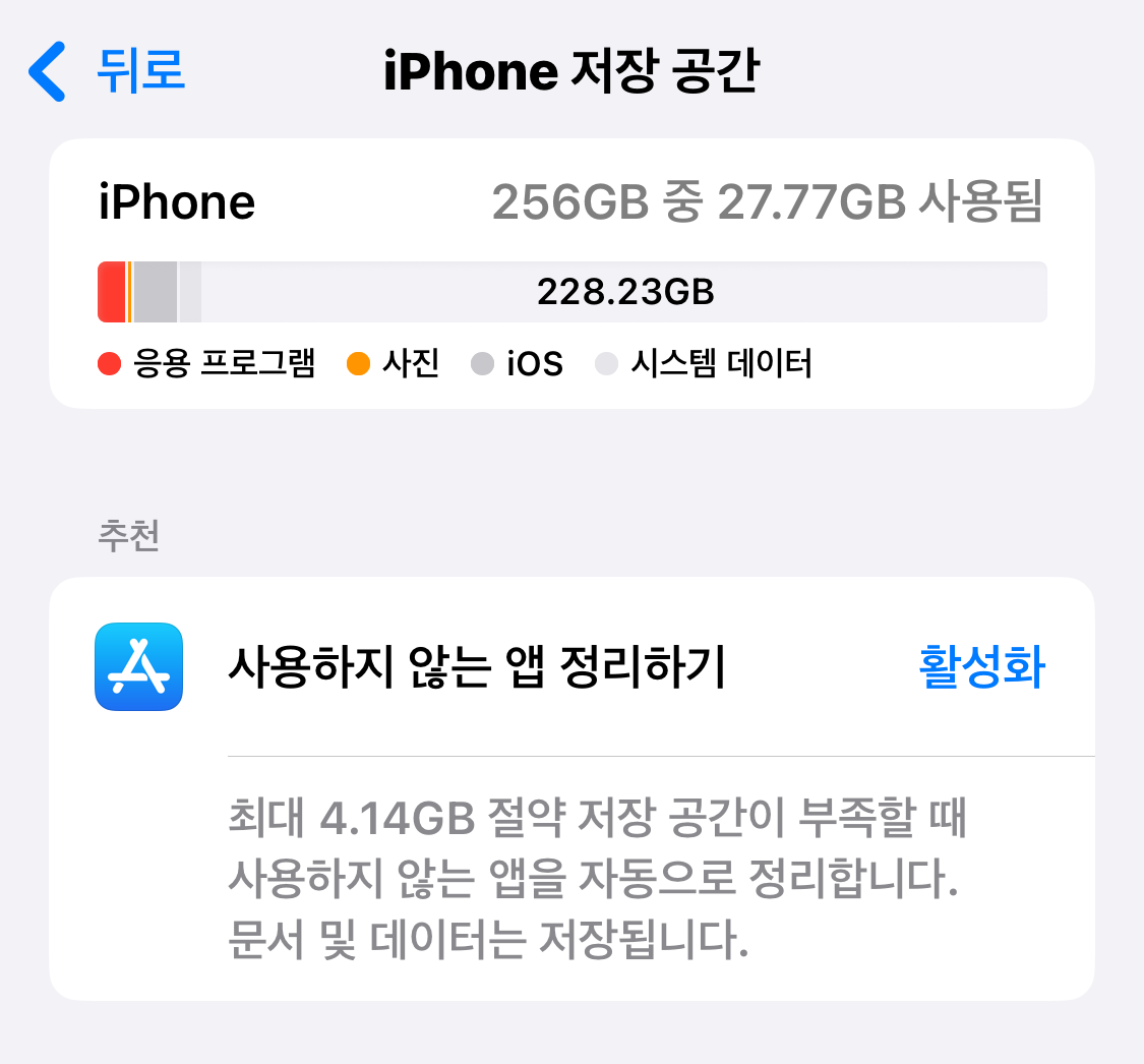 저장 공간이 부족하면 카메라 앱이 작동하지 않을 수 있습니다. 설정 > 일반 > iPhone 저장 공간에서 사용 가능한 용량을 확인하고, 불필요한 파일이나 앱을 삭제하여 충분한 여유 공간을 확보해야 합니다.