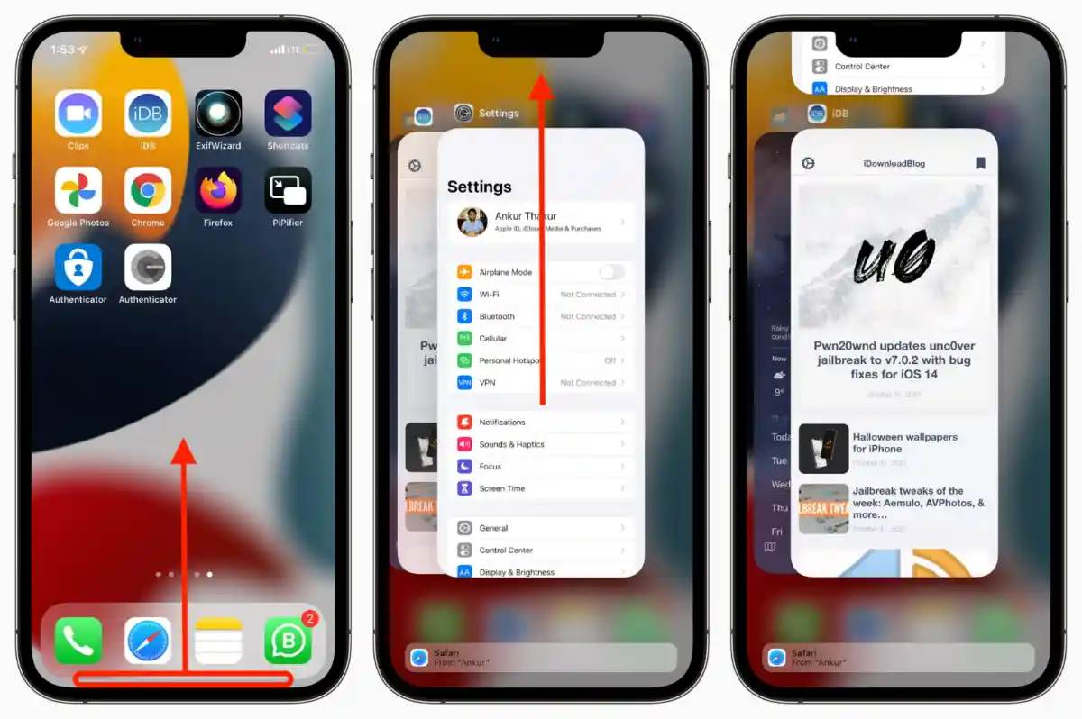 일시적인 버그로 인해 카메라 앱이 응답하지 않거나 멈추는 경우가 있습니다. 홈 화면에서 앱 전환 화면을 열어 카메라 앱을 위로 밀어 강제 종료한 후, 다시 실행하여 문제가 해결되는지 확인하십시오.