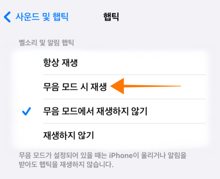 - 햅틱을 클릭하고 무음 모드 시 재생을 선택합니다.
