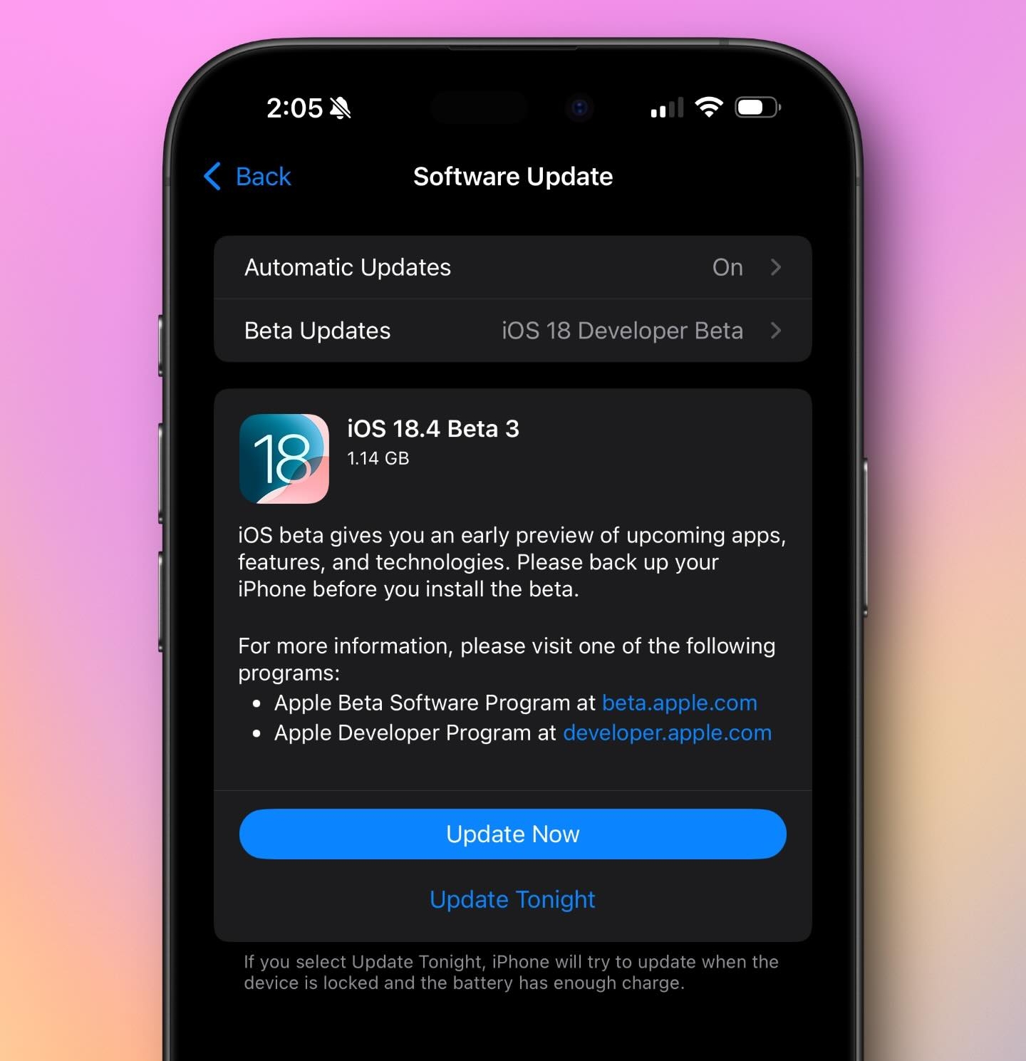 - '설정' > '일반' > '소프트웨어 업데이트'에서 iOS 18.4 베타 3를 다운로드하고 설치합니다.