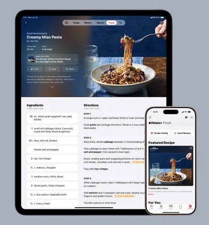 Apple News+ 구독자를 위한 새로운 Apple News Food 섹션이 추가되었습니다. 이 섹션은 Allrecipes, Bon Appétit, Food & Wine과 같은 유명 음식 매거진의 레시피, 레스토랑 정보, 건강한 식습관 요령, 주방 필수품 등 풍부한 음식 관련 콘텐츠를 제공합니다.