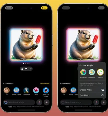 Image Playground 앱에 새로운 ‘스케치’ 스타일이 추가되었습니다. 기존의 애니메이션 및 일러스트레이션 스타일과 함께 스케치 스타일은 크리에이터에게 더욱 다양한 창작 옵션을 제공합니다. 이전에는 Image Wand에서만 사용할 수 있었던 스케치 스타일을 이제 Image Playground 앱 내에서 자유롭게 활용하여 독창적인 이미지를 제작할 수 있습니다. 스타일 변경은 앱 내 ‘+’ 버튼을 통해 간편하게 이루어집니다.
