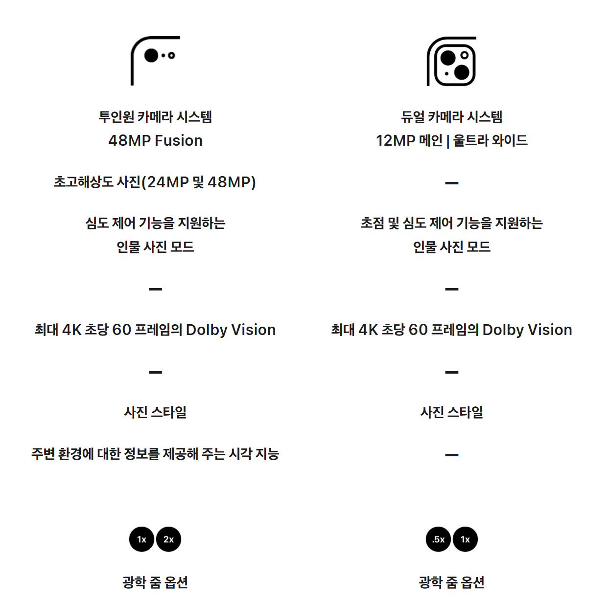 | 후면 카메라 | 48MP 메인 | 12MP 메인, 12MP 초광각 |