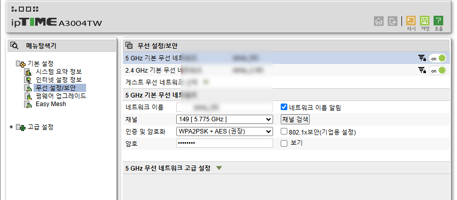 - 무선 설정/보안 선택: 관리자 페이지에서 '무선 설정/보안' 메뉴를 선택합니다. 여기에서 2.4GHz 및 5GHz 네트워크 설정을 변경할 수 있습니다.