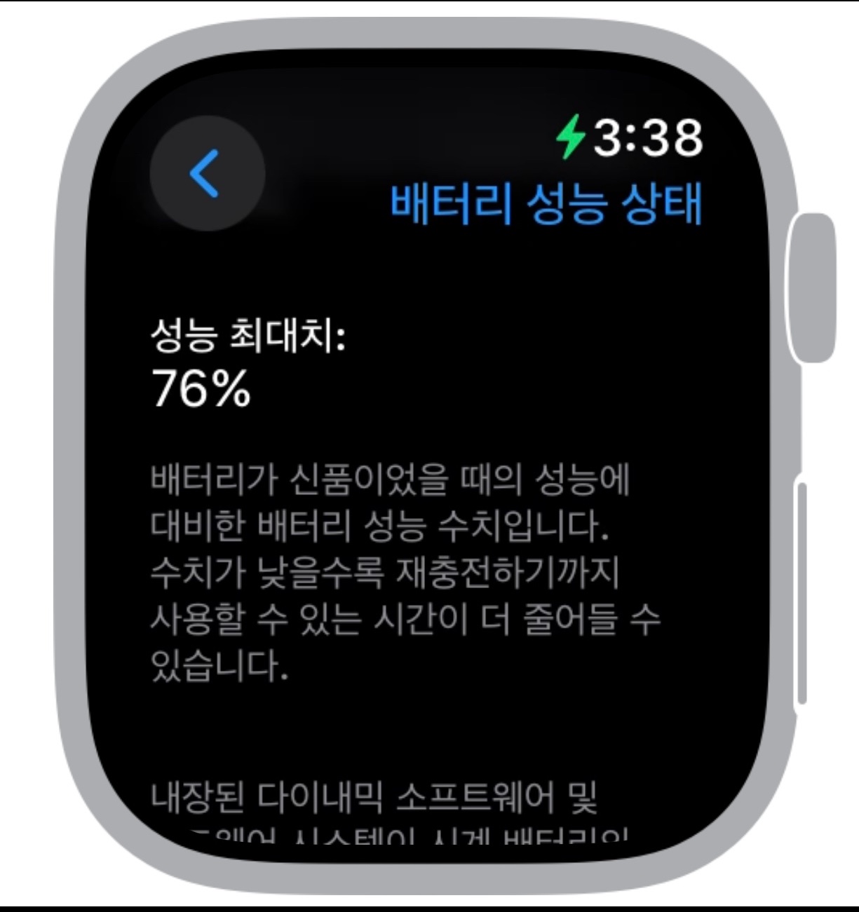 배터리 상태 메뉴에서 애플워치 배터리의 최대 용량을 확인할 수 있습니다. 배터리 최대 용량은 애플워치가 새 제품일 때와 비교하여 현재 저장할 수 있는 배터리 용량을 나타냅니다. 일반적으로 80% 이상이면 양호한 상태로 간주됩니다.