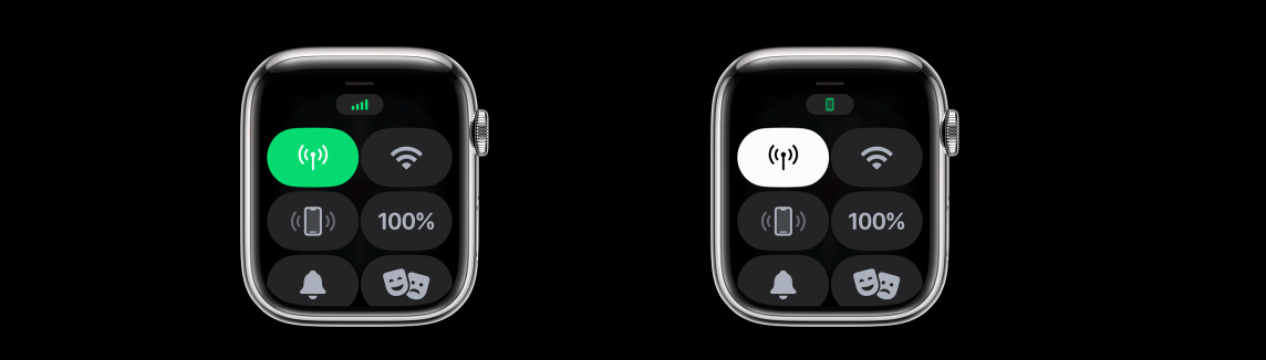 - 셀룰러 아이콘이 녹색이면 애플워치가 모바일 데이터 네트워크에 연결된 상태이며, 화면 상단 중앙의 녹색 막대는 신호 강도를 나타냅니다.