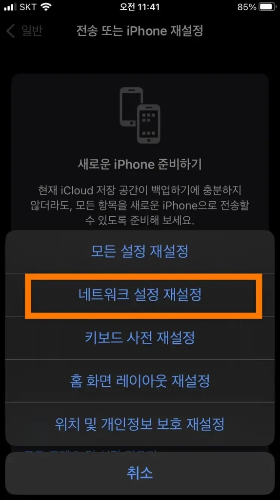 • 설정 → 일반 → 재설정 → 네트워크 설정 재설정 (모든 와이파이, 블루투스 연결 정보가 초기화됩니다.)