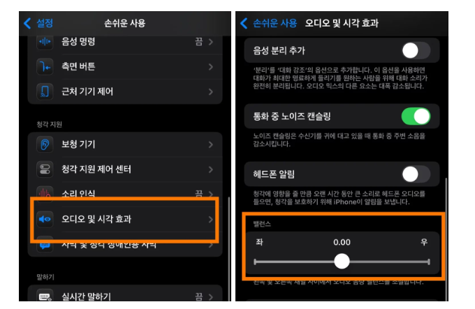 - 설정 > 손쉬운 사용 > 오디오 및 시각 효과 > 밸런스에서 슬라이더가 중앙에 있는지 확인하세요.