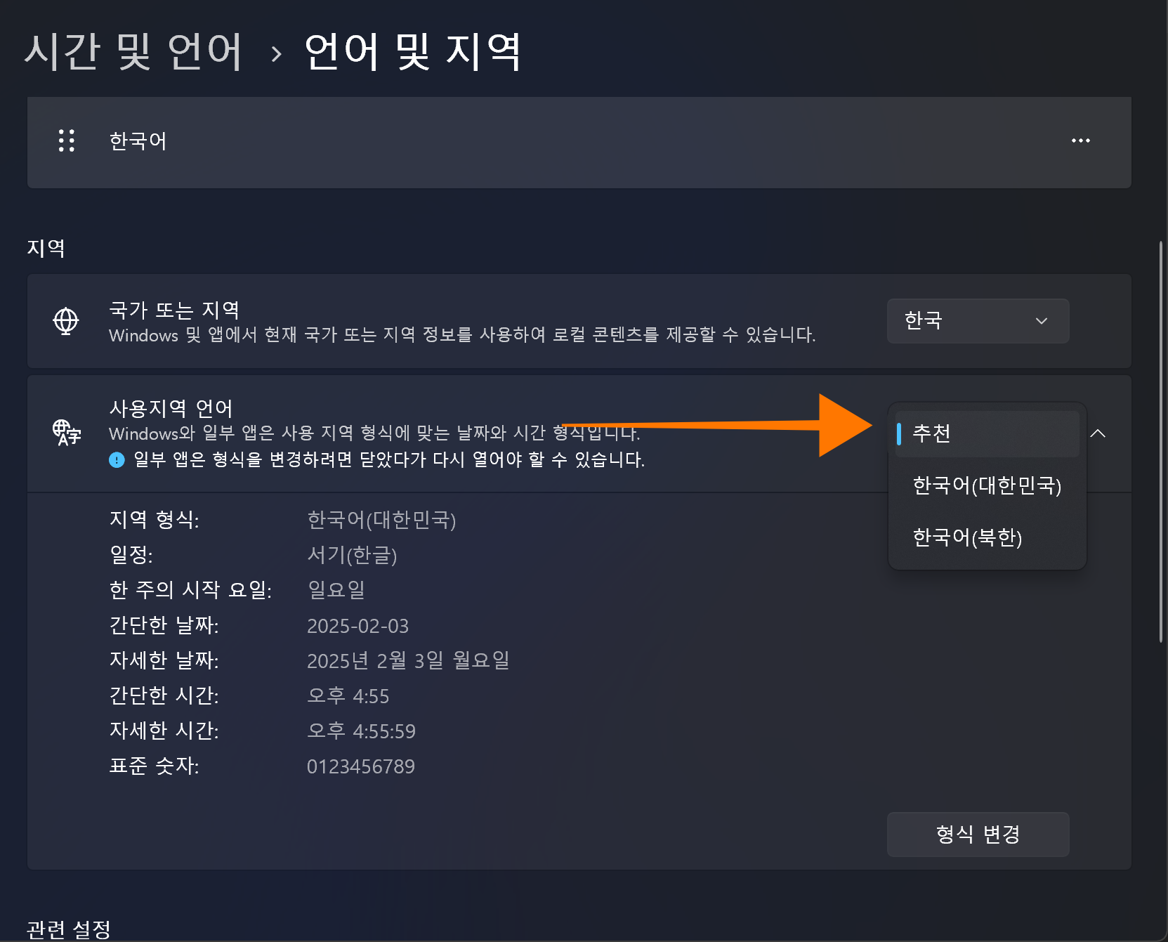 - 지역 형식 변경: "지역 형식" 드롭다운 메뉴에서 원하는 지역을 선택합니다.