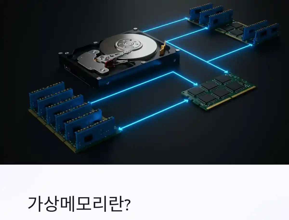 가상메모리는 윈도우 운영체제에서 하드디스크의 일부 공간을 메모리처럼 사용하는 기능입니다. 물리적인 램이 부족할 때, 디스크 공간을 임시 메모리로 활용하여 프로그램 강제 종료나 시스템 멈춤을 방지합니다.