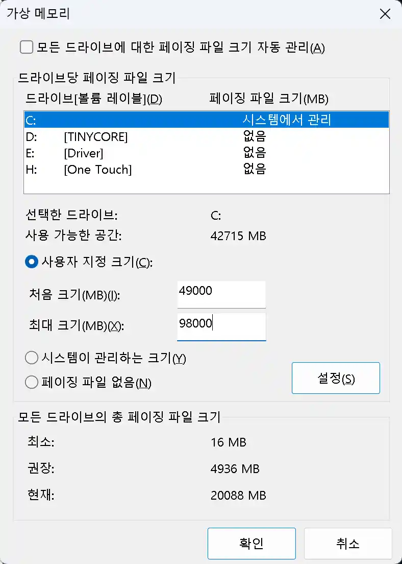 - C드라이브 외의 드라이브에 설정하는 것은 운영체제 응답성과 안정성 측면에서 바람직하지 않습니다.