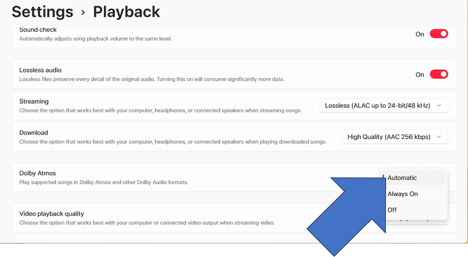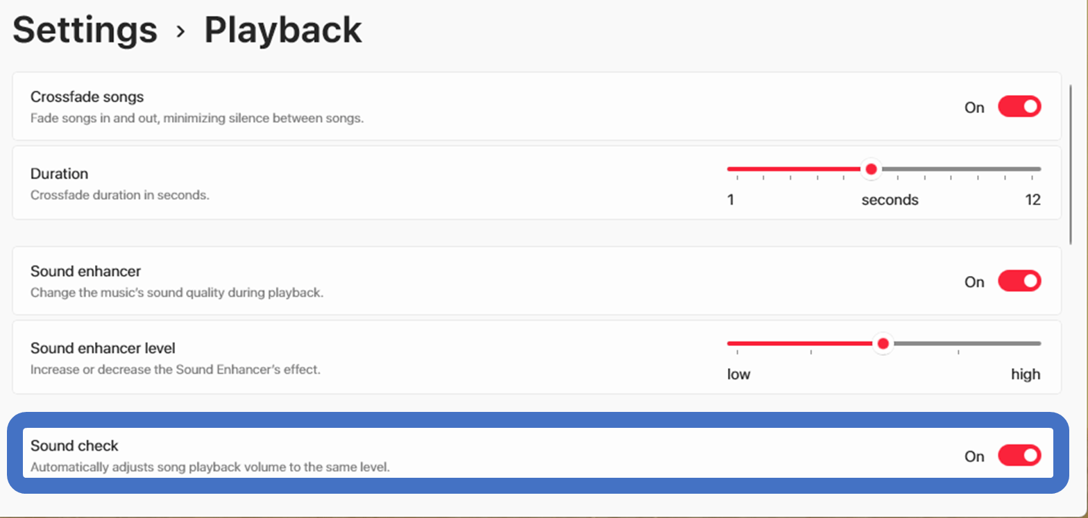 • 음량 문제: 돌비 애트모스 트랙이 일반 스테레오 트랙보다 소리가 작게 느껴진다면, 설정 > 재생 섹션에서 '사운드 자동 조절'(Sound Check) 옵션을 활성화해 보십시오. 이 기능은 곡 간의 음량 편차를 줄여주는 역할을 합니다.