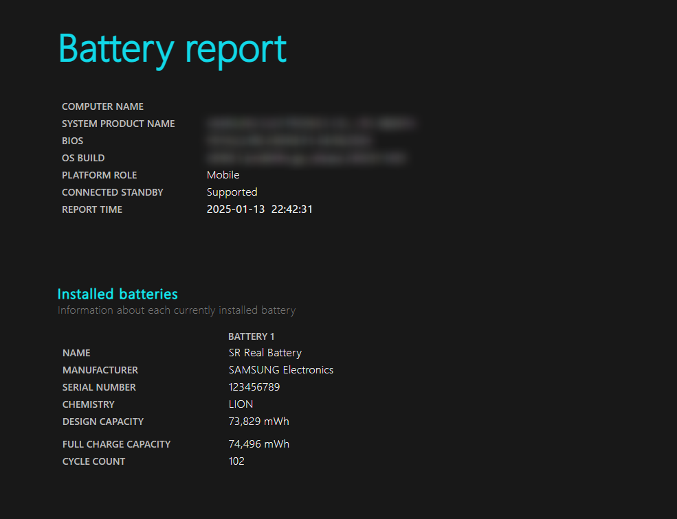 - C 드라이브에 생성된 battery-report.html 파일을 열어 배터리 정보를 확인합니다.