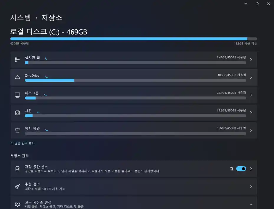 윈도우11에는 스토리지 분석 기능이 내장되어 있습니다.